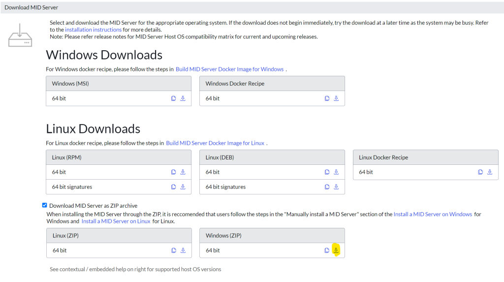 Critical to the design is the installation of the MID Server in your developer instance. Typically this is installed via the installer on the site, but requires a few extra steps when installing on, say, your PC. First what you will want to do is navigate to MID Server >> Downloads. On the Downloads screen, check the “Download MID Server as ZIP archive” which will present the Linux and Windows option. Click the download button (highlighted below) and save the zip to the file location where the MID Server will be installed from.